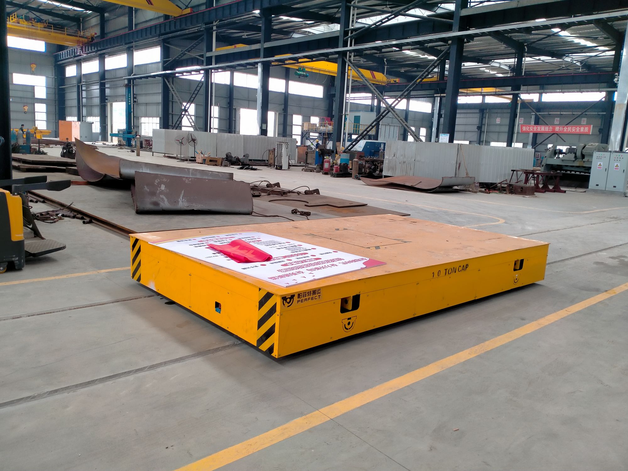 車間過跨擺渡車,板材車間使用,中間地面滾輪支撐,實現(xiàn)過跨擺渡